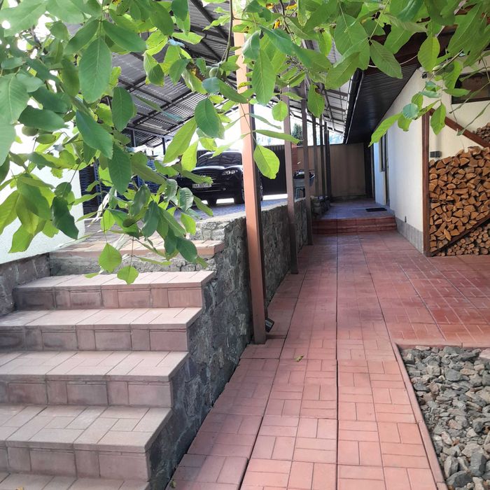 • Крита парковка для 4 машин(висота дозволяє заїхати великогабаритному транспорту) з відкатними автоматичними воротами .