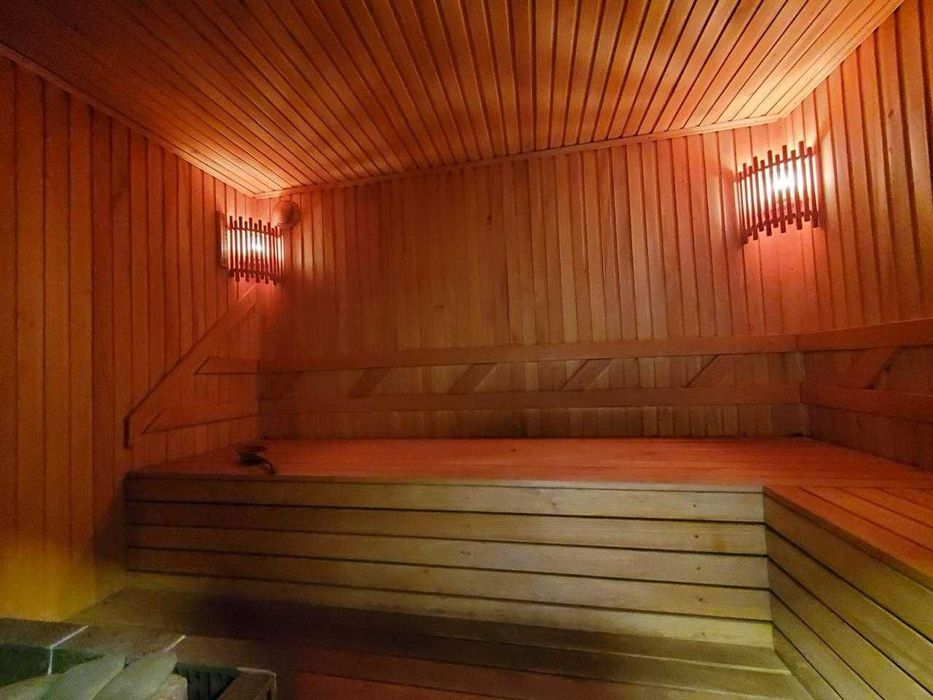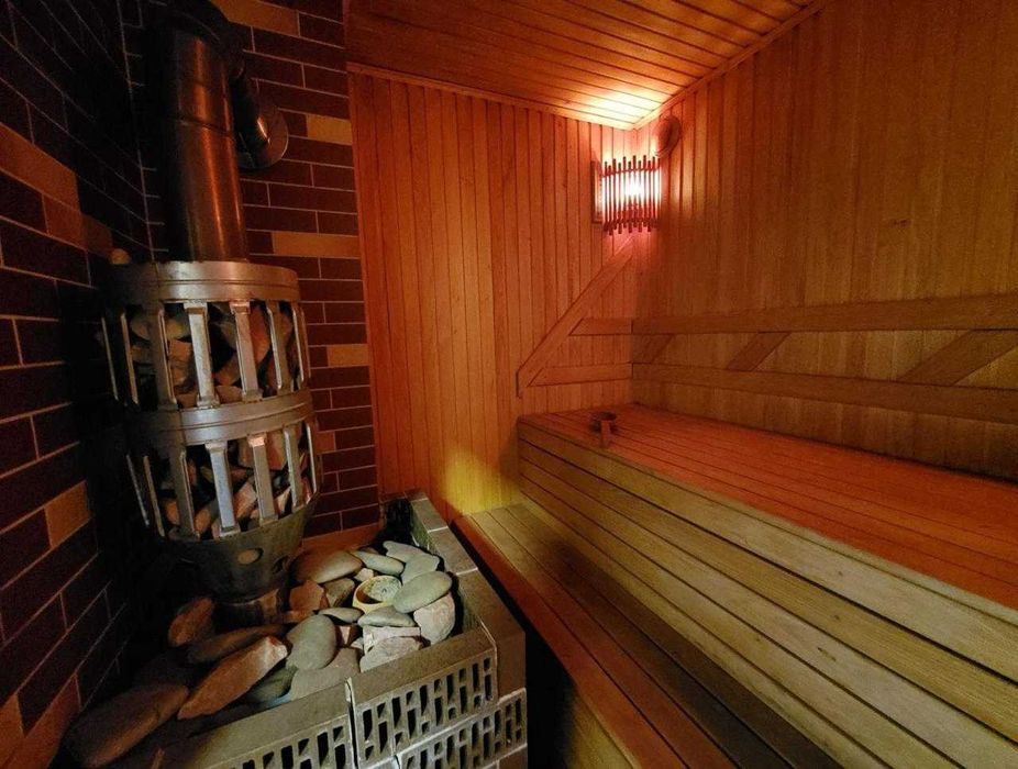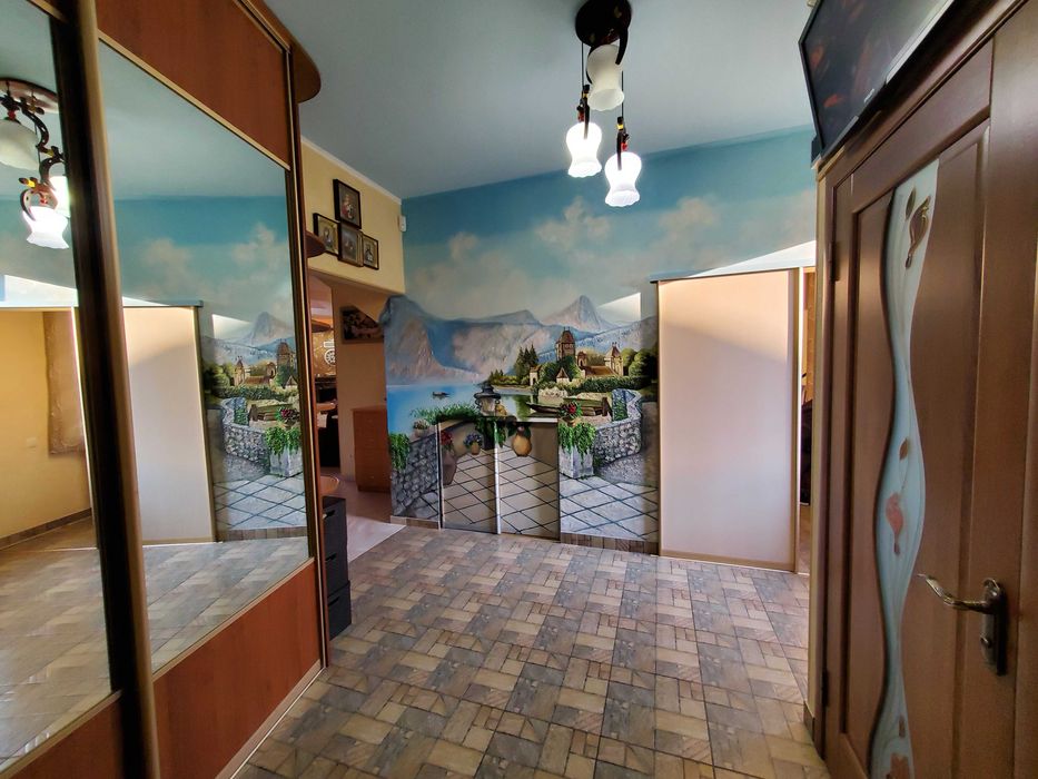 Перед входом до будинку є зона відпочинку з водоймою та декоративними рибками, тераса з барбекю, плитою та шафою. На першому поверсі спальня, вбиральня, кабінет, кухня з вбудованою побутовою технікою, велика вітальня з каміном (обігріває 3 кімнати), у ванні сауна, душова (у душові відро для обливання холодною водою), унітаз, біде, пральна та сушильна машинки та окремо гостьовий туалет. На другому поверсі 4 спальні, велика кімната для відпочинку, ванна з туалетом та біде. У цокольному поверсі гараж (зі стелажами) на 2 автомобілі, льох, котельня, водонапірна, збройова кімната та кімната для відпочинку.