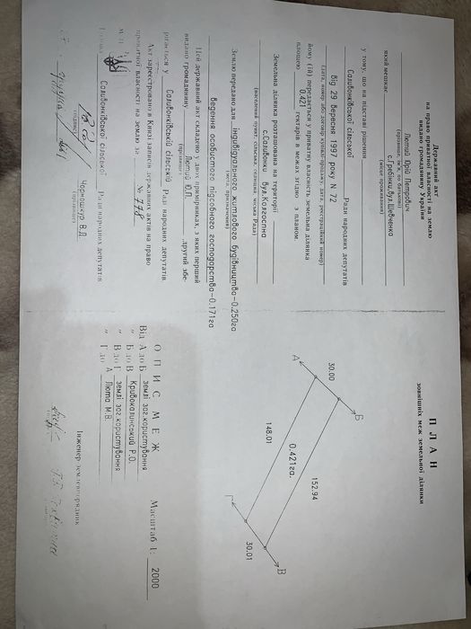 •Розмір:42 сотки (25 під забудову, 17 під сіл. господарство)•
