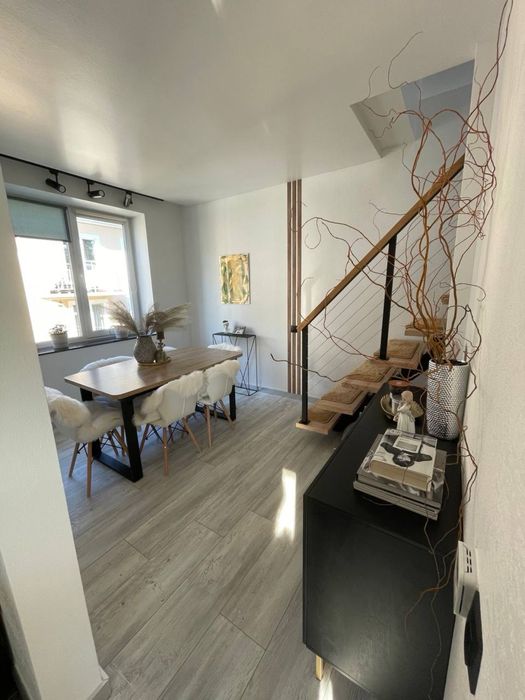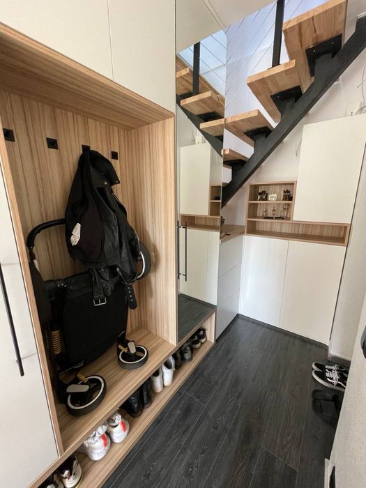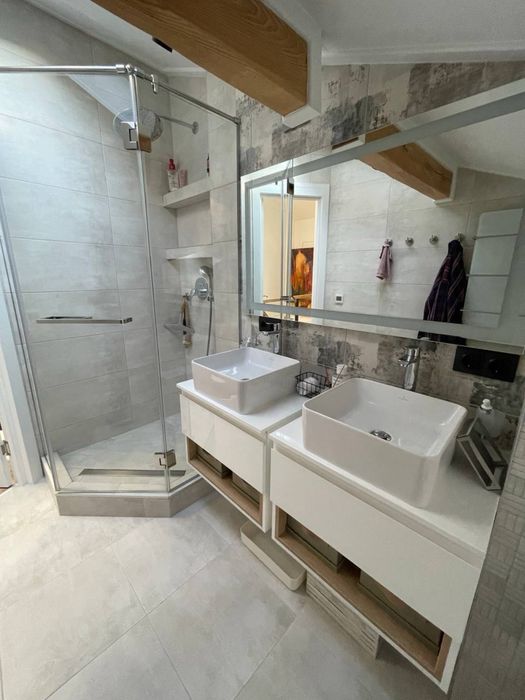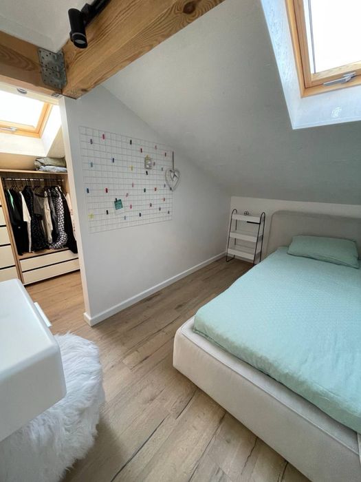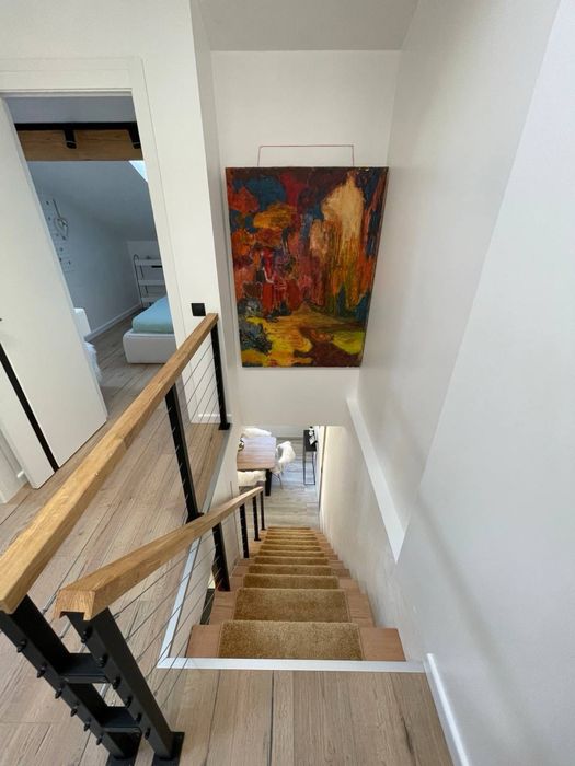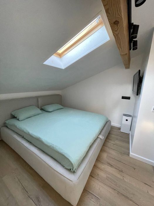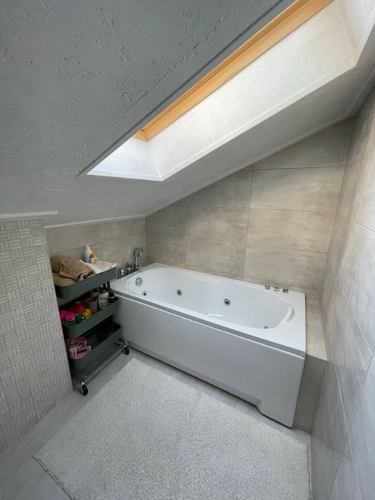 80 кв.м. 5 кімнат (2 спальні, столова, куня+вітальня, передпокій), 2 повноцінні санвузли (1 - душова, гідромасажна ванна з мансардним вікном, 2 - велика ванна). Обидва поверхи створені з застосуванням дорогих та екологічно чистих матеріалів: фарба, підлога, фасади і т.д. Усе безпечне для здоров’я дорослих, дітей і тварин. Усе зроблено під замовлення, продумано, розумно і функціонально. Тут багато натурального дерева, металу і любові. Квартира будувалася для себе з усього найдорожчого і найкращого. Сантехніка Villeroy&Bosch, Grohe, техніка Gorenje, посуд Bergoff, плитка Іспанія та Італія, величезний диван ручної роботи, якісні крафтові столи з натурального дерева, потужний діспоузер, містка посудомийка, все в стані нового та ін. Котел. Дах перероблений за свої кошти та перекладений дорогими якісними матеріалами, щоб було тепло та сухо. Ремонт і проєкт авторські. Гардеробна містка та функціональна, має багато місця для зберігання. Висота стель 2 поверху різна, бо поверх мансардний, але всі активні та важливі для життєдіяльності предмети/поверхні в доступі та зручні у використанні. 1 поверх - це 90% денного часу, 2 - близько 10% - в основному сон. Квартира ідеально підійде для родини з 2-3 людей.