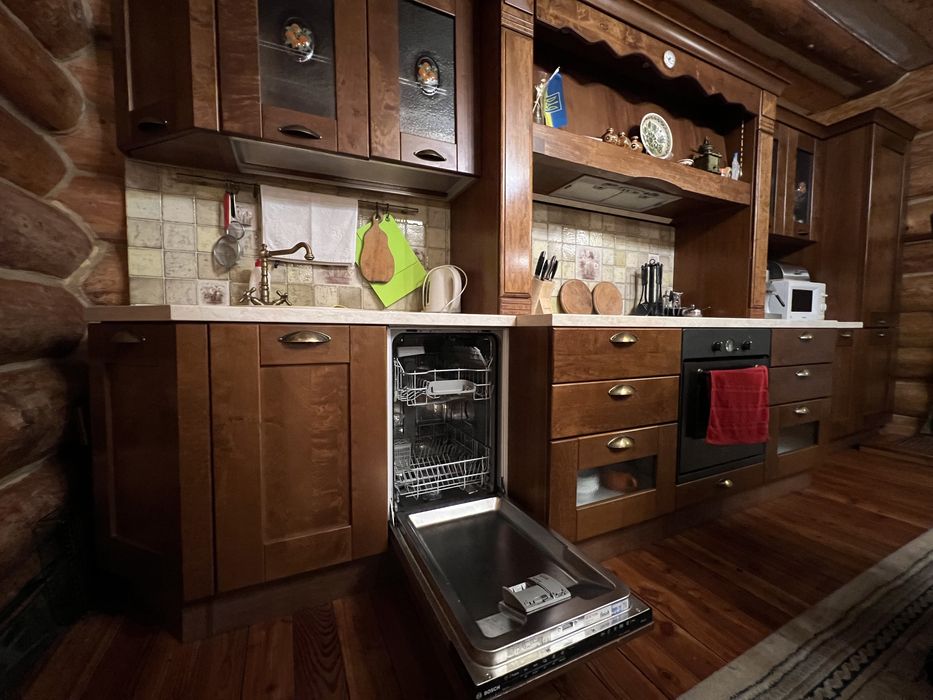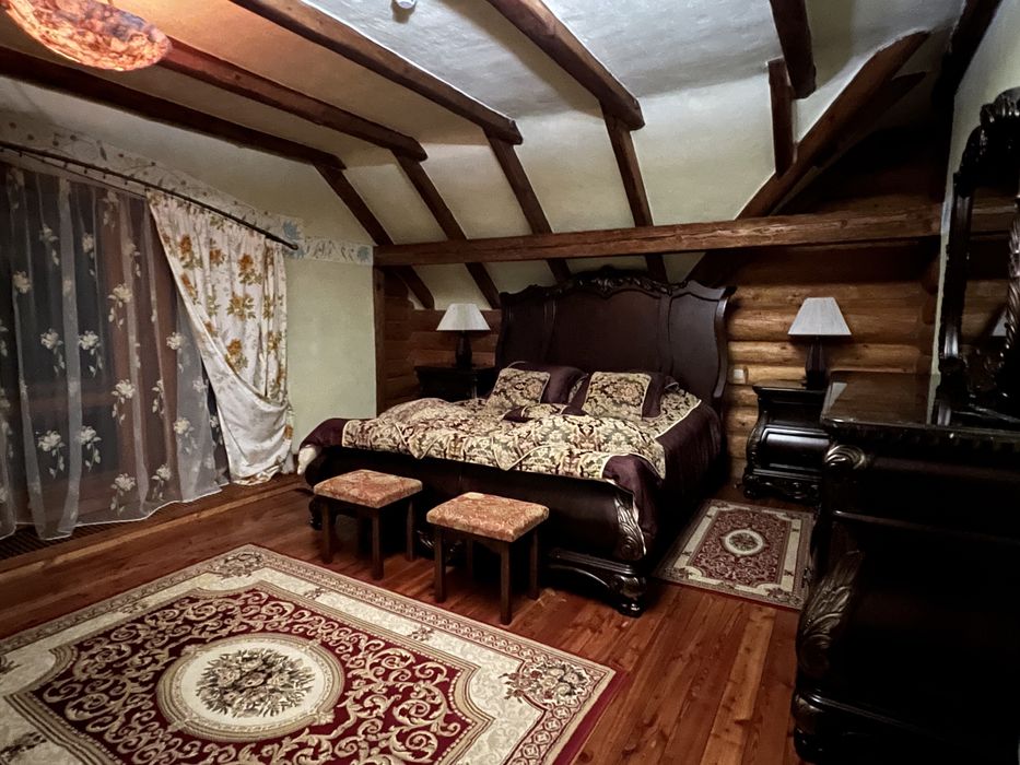 В оздобленні будинку використовувались імпортні дорогі оздоблювальні матеріали, в спальнях якісні дерев‘яні меблі. Будинок виконано в сучасному етно-стилі, в дизайні багато ексклюзивних деталей виконаних вручну майстрами по дереву.