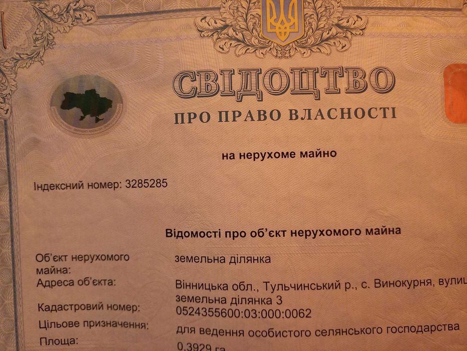 Продам участок в Винокурне Винницкой обл.; Продам участок в Винокурне Винницкой обл. 0,3929 га. Участок находиться в живописном месте, возле леса и озера. Участок находиться 400 метров от Шпиково. По улице есть газ и свет. Можно будет провести к участку ортезианскую воду, очень вкусная вода. Также можно будет провести интернет.