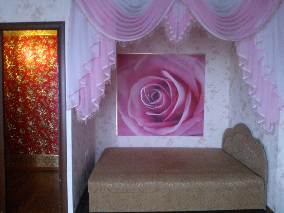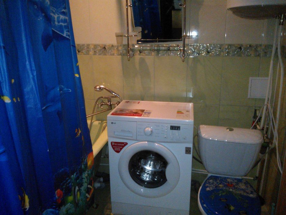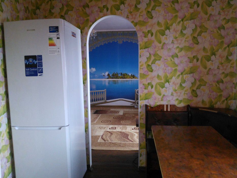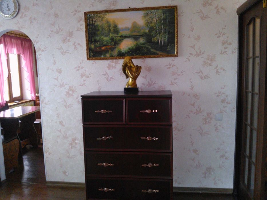 Квартира з меблями (кровать, кухня, шкаф-купе, кухонний уголок, комод) та технікою ( холодильник, бойлер, пральна машина, телевізор). На підлозі скрізь ленолеум.