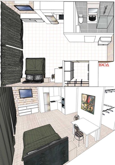 на последних фото показываю некоторые эскизы по планировке, как мы планировали обыграть дизайн. но планировка может быть ваша любая какую пожелаете, хоть и одну просторную комнату-студию с минимальными вложениями.