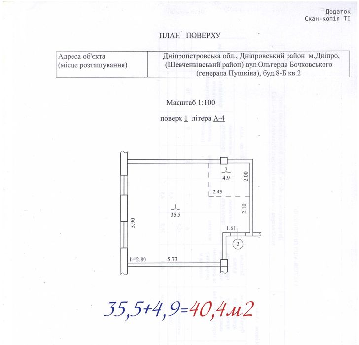 Общая площадь по техпаспорту 40,4м2.