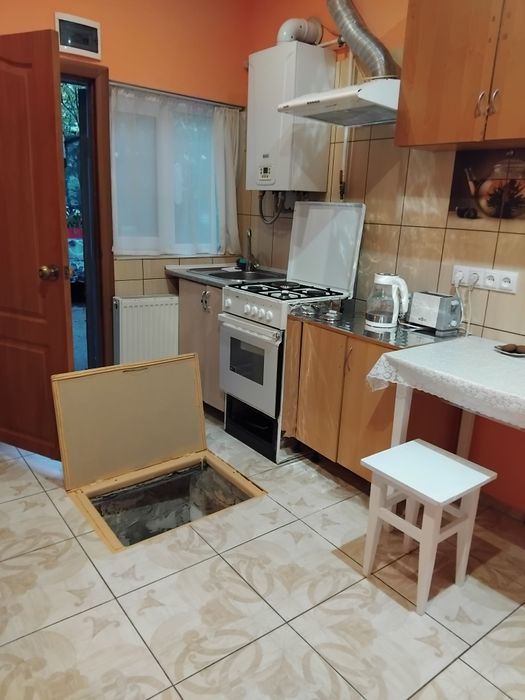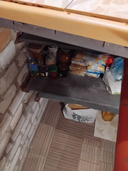 в кухне есть небольшой подвальчик для консервации и овощей .