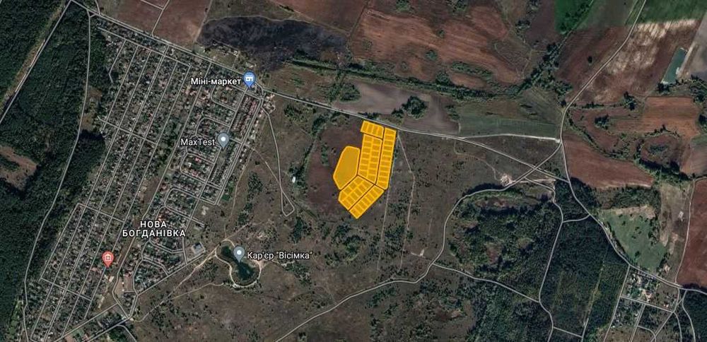 Фасадна ділянка 7 га з озером біля лісу, поруч ліс, озеро, траса; Богданівка, Броварський район, Київська область. Продаж фасадної ділянки 700 соток – 46 ділянок по 12 соток (5.52га) під забудову та ділянку 1.53Га ОСГ під озеро. Масив ділянок знаходиться поряд з к/м Нова Богданівка та С/Т Залісся. До масиву асфальтований під'їзд, поруч ліс, Національний природний парк "Залісся", Броварська траса, Бровари 18км, поблизу метро Лісова, Троєщина, Биківня, Київ. Недалеко їхати і до річки Десна, до селищ Погреби, Зазим'я, Пухівка, Рожни. Сусідні населені пункти Велика Димерка, Скибін, Калинівка, Рожівка, Красилівка, Требухів, Княжичі. Об'єкт продається, як по 12 соток, так і разом 700 соток. Цікава пропозиція для забудовників, а також для інвесторів у землю під Києвом на перспективу. Земля підійде під котеджне містечко, готель, базу відпочинку, модульні будинки тощо. Можливе розширення та освоєння прилеглої території. Документи під забудову, приватна власність. Ціна 175-550 дол. сотка, торг можливий. У Богданівці до продажу є декілька варіантів. Розглядаються будь-які пропозиції, подробиці по телефону.