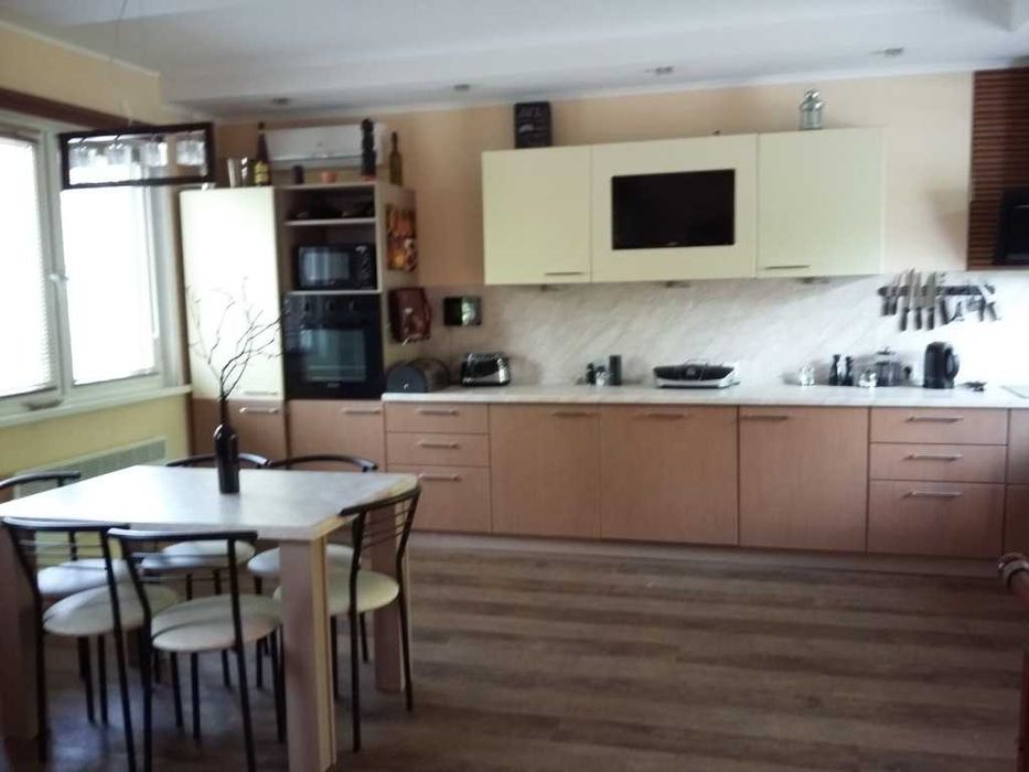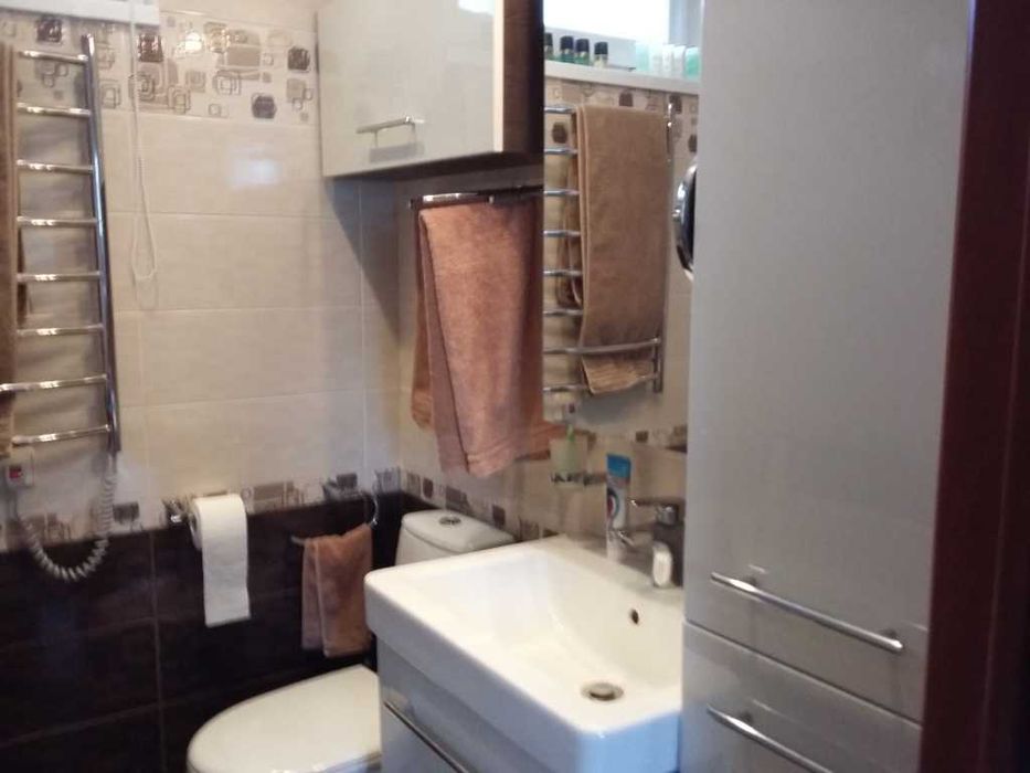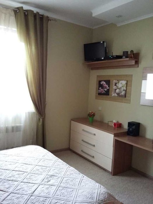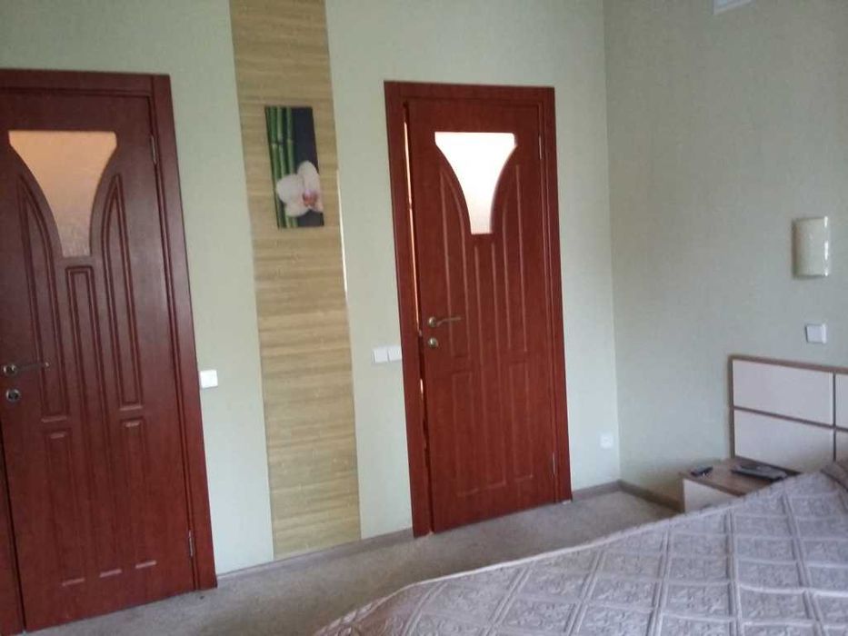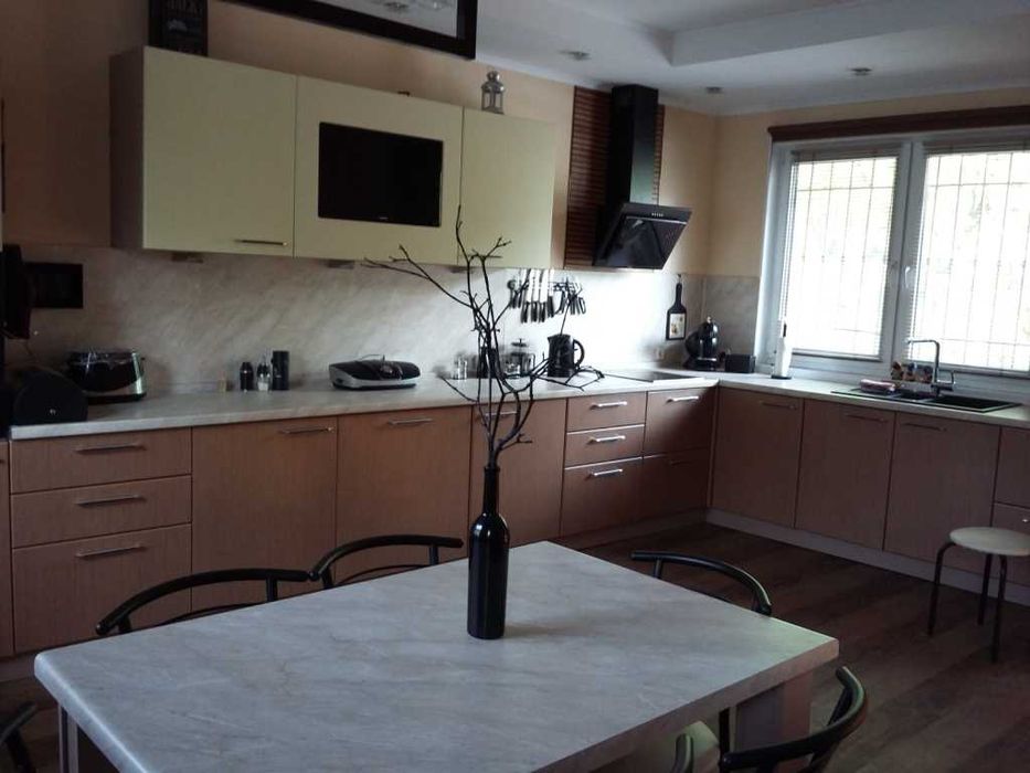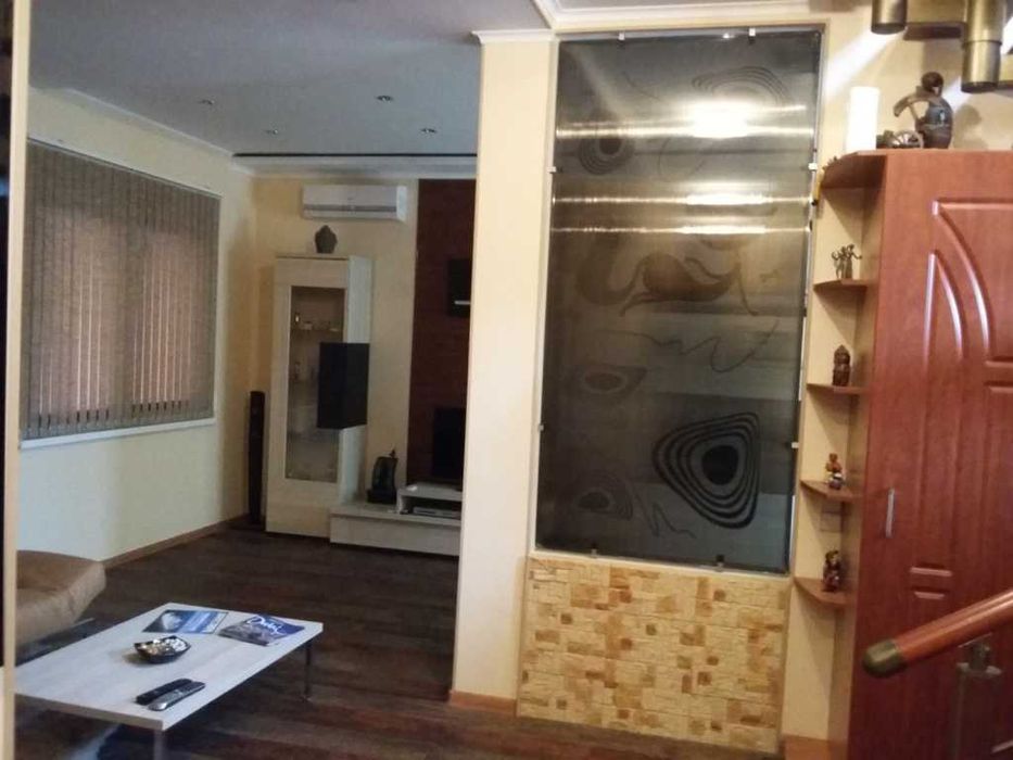 цифровыми ресиверами, 3 кондиционера, стир. машина, сейф, холодильник для вина и встроенная техника: холодильник-морозильник, посудомоечная машина, микроволновка. Есть вся необходимая посуда и бытовая техника- эл.чайник , кофеварка, миксер и т.д. Также Dvd , аудио система, дом. кинозал. Ворота автоматические, управление с пульта, но предусмотрено отключение дистанционного управления и переход на ручное управление . . В туалетах, тамбурах и на всем первом этаже - теплый пол. В туалетах полотенцесушители , вентиляция, мебель - все новое. Стильная мягкая кожаная мебель в зале, современное декоративное панно с подсветкой, мебель с подсветкой, картины с подсветкой - отличный дизайн в стиле Хай-тек. В спальне удобная кровать, современная мебель, красивый дизайн. Доп. внутренние ролеты на всех окнах для полной светоизоляции, а двухкамерные стеклопакеты для доп. звукоизоляции. В кабинете вся встроенная мебель, кресла, стол 180х90. В гардеробной- встроенная мебель, утюг, доска, пылесос. В гараже отдельное помещение- кладовая и помещение, где стоят бойлера и котел с обвязкой. Сейф спрятан.