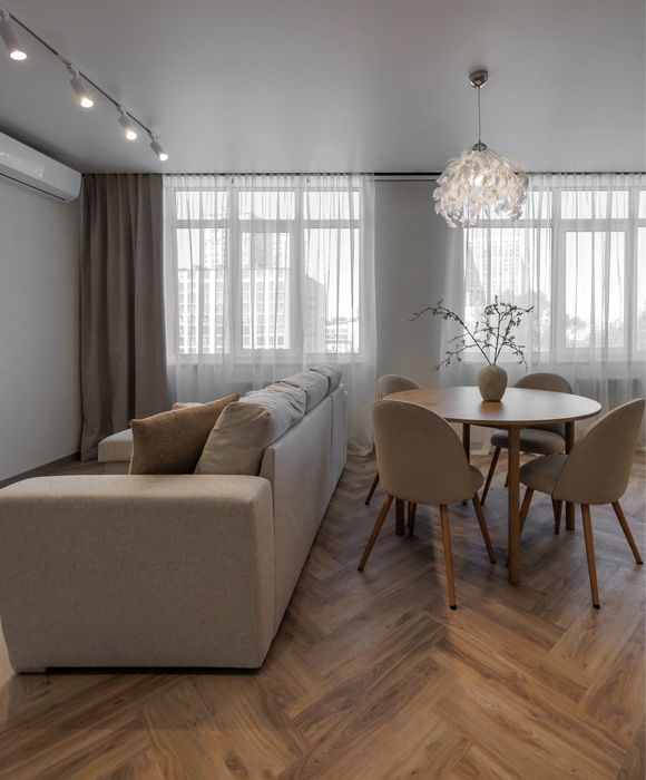 Стеля – натяжна, трекові світильники, на підлозі бельгійський кварц-винил