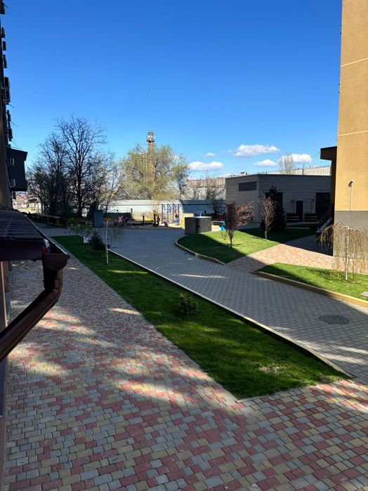 Во дворе детские площадки и частный детский сад, который видно из окна квартиры.