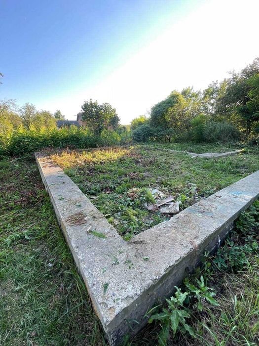 На території є фундамент 10 на 7 метрів, сад з плодовими деревами та невеликий город.