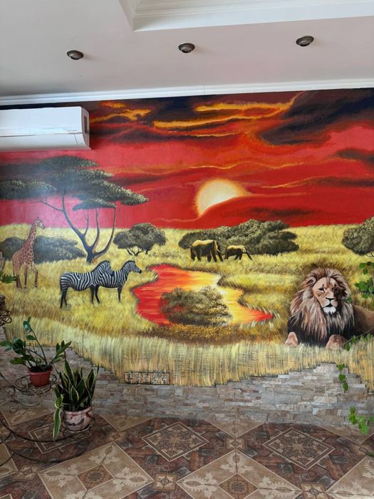 • Гостиная в тематике Африки: камин и авторская картина «Сафари», создающая атмосферу уюта и вдохновения.