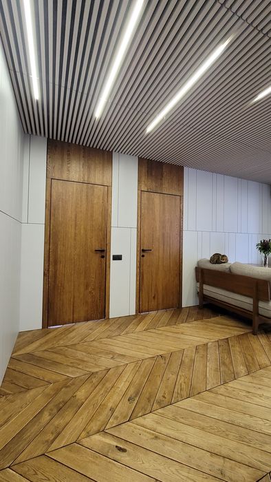 Підлога, двері, ліжко з натурального дуба.