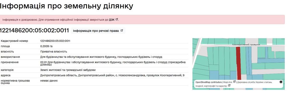 ПРОДАЖ Земельної ділянки, с. Новоолександрівка, Дніпропетровська обл.; Земельна ділянка кадастровий номер: 1221486200:05:002:0011, площею 0.2009 га Цільове призначення : 02.01. Для будівництва та обслуговування житлового будинку, господарських будівель і споруд Категорія земель: Землі житлової та громадської забудови Місце розташування: Дніпропетровська область, Дніпропетровський район, с. Новоолександрівка, провулок Кооперативний, 9.