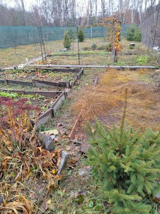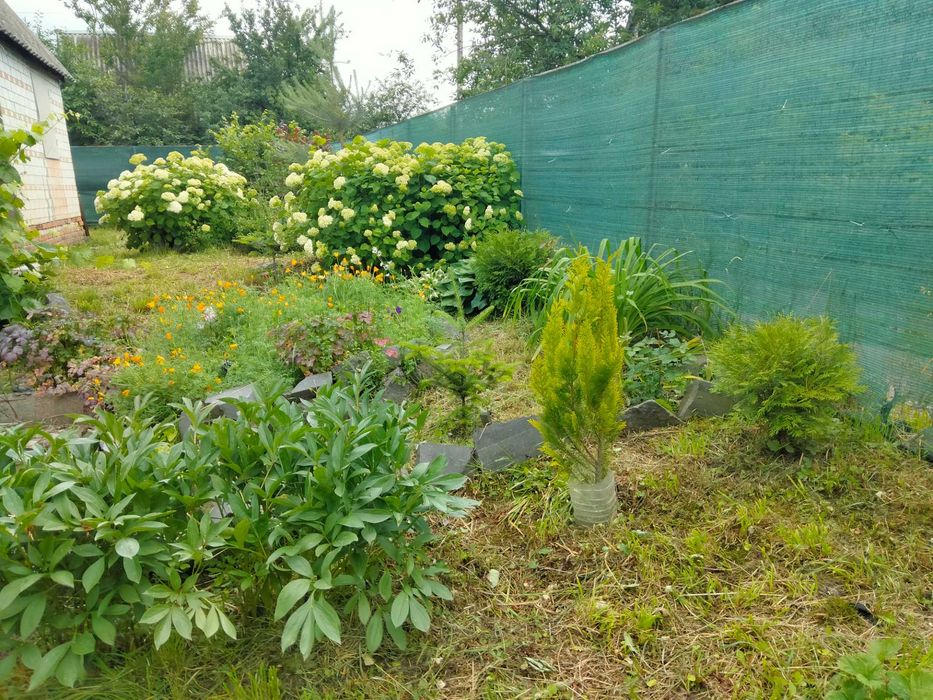 Благоустрій дачі під відпочинок, декоративна зона та декілька земельних грядок, молоді фруктові дерева.