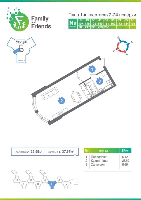 Загальна площа квартири складає 37,67 м2