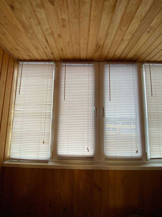 Два балкони — один оздоблений деревом, другий — пластиковими матеріалами.