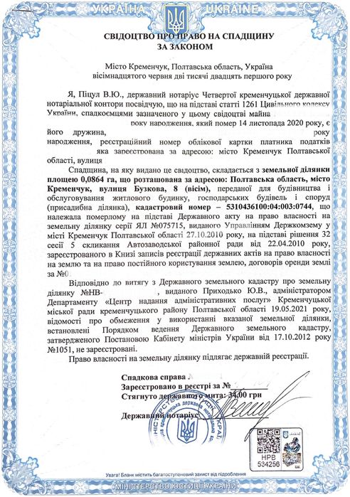 Продам земельну ділянку під забудову, м. Кременчук ,вул. Бузкова 8.; Продається земельна ділянка 8.64 соток (0.0864 га)під забудову.
