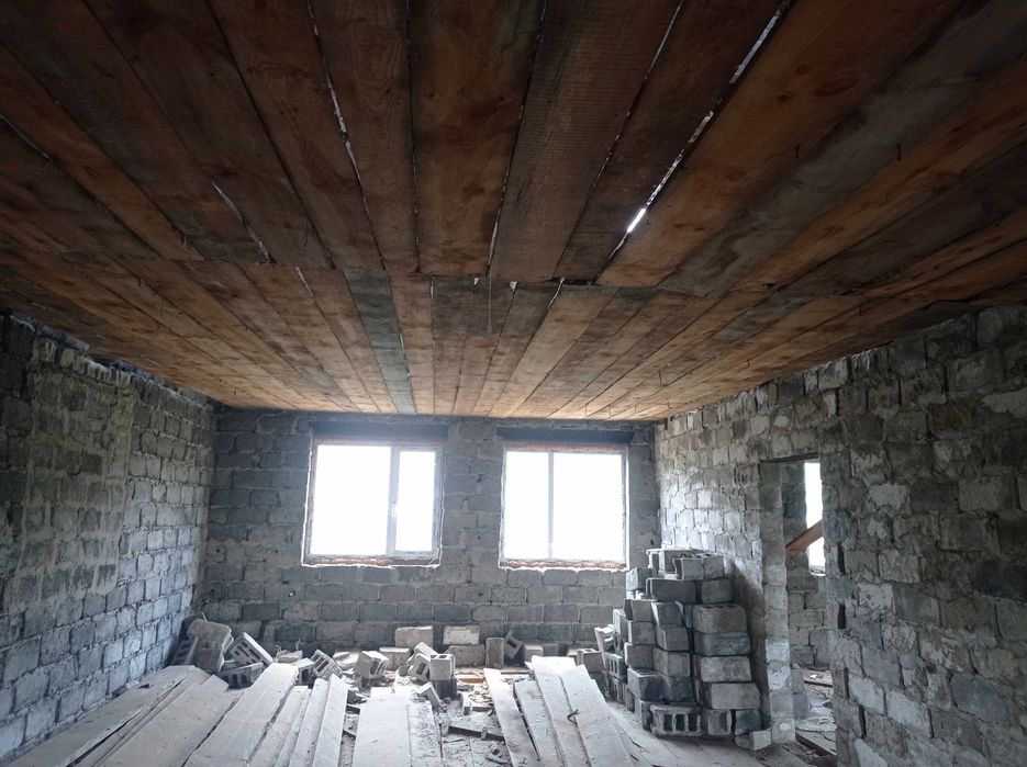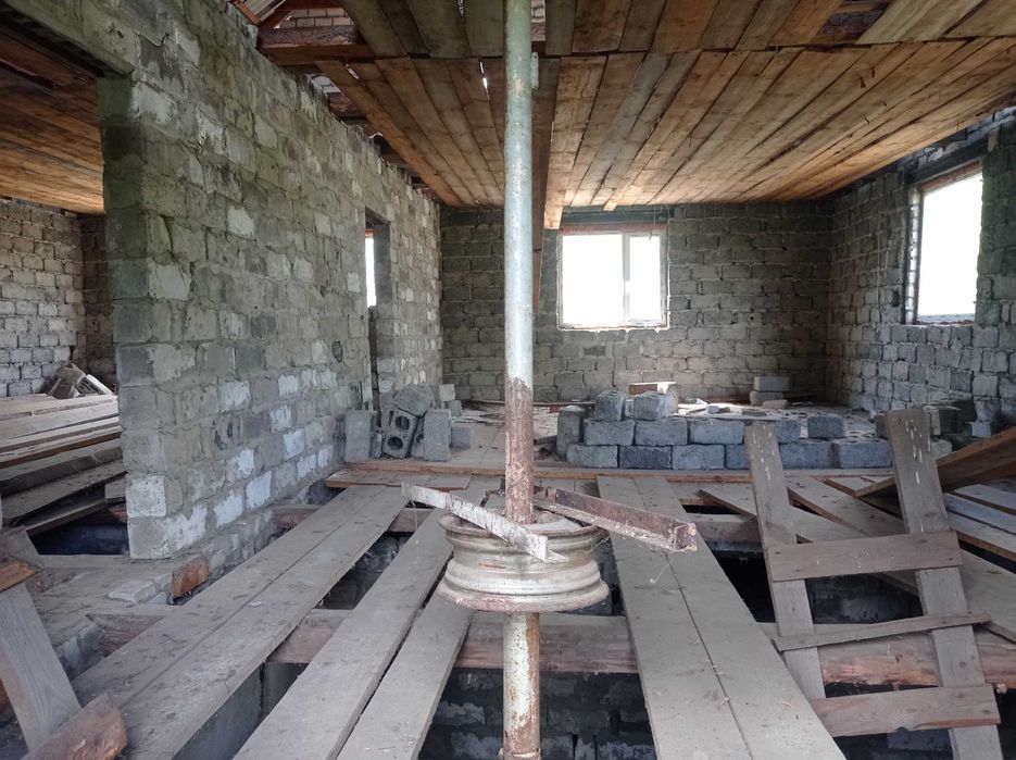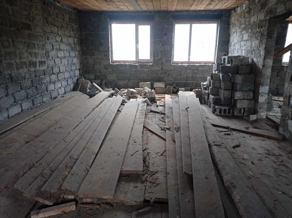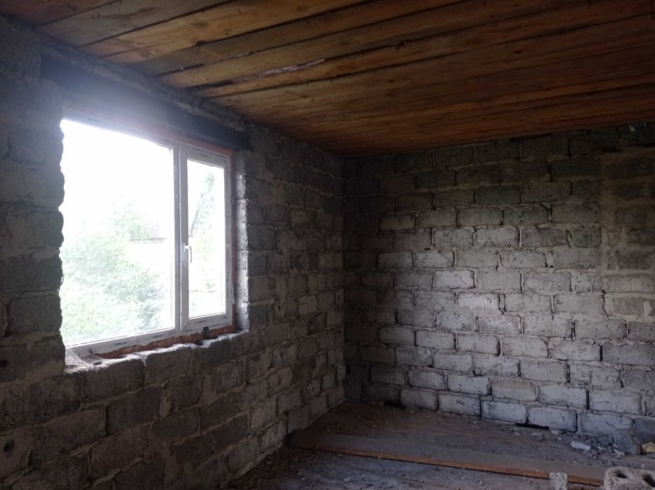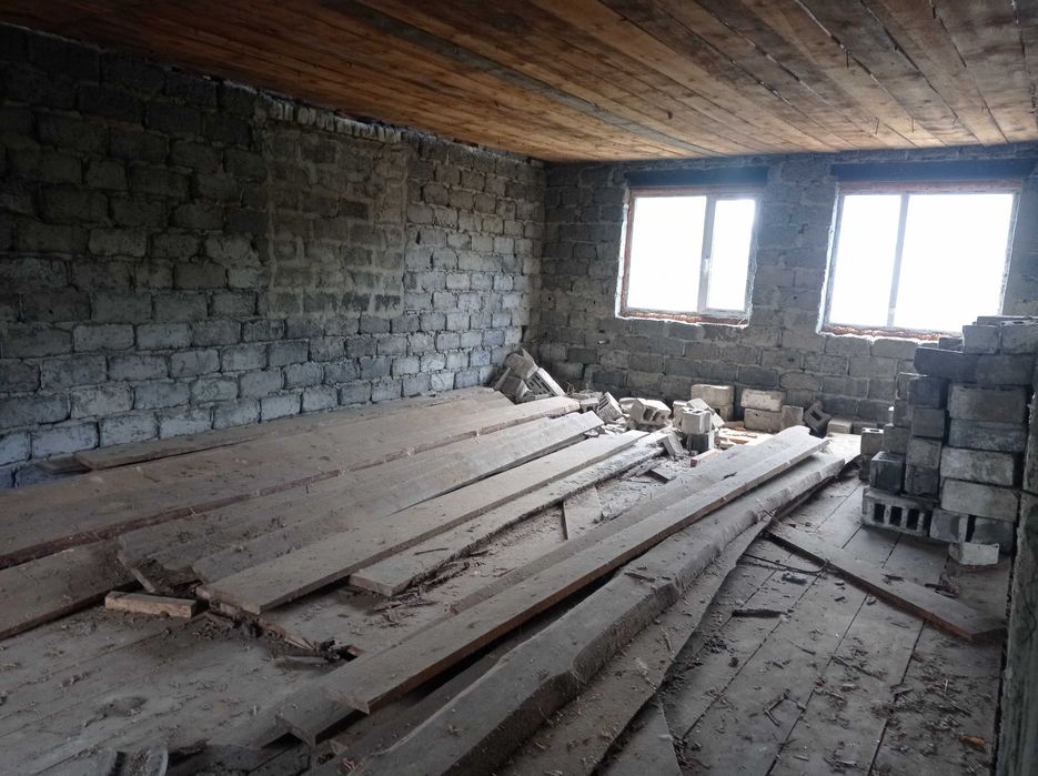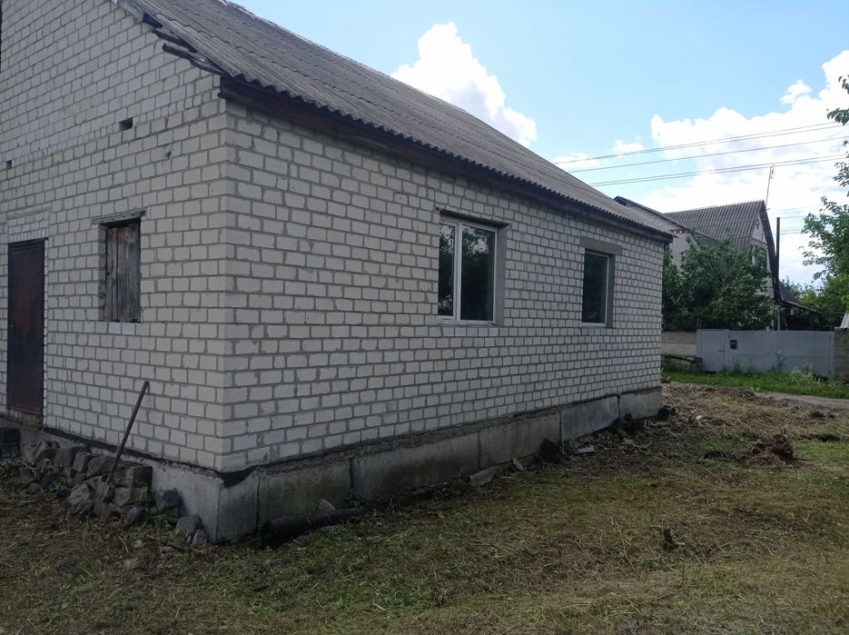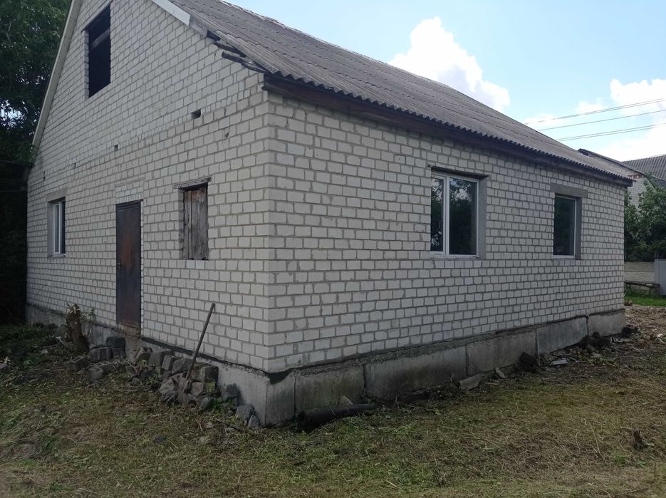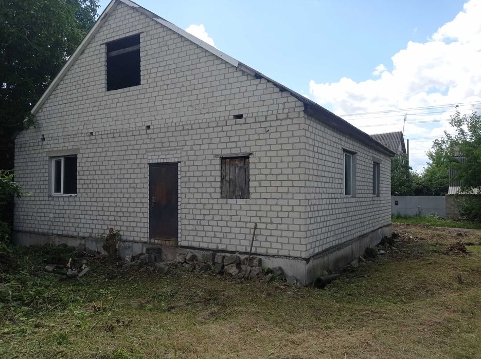 Продам не дострой; Продам дом,110 КВ, м. в Змиеве за микрорайоном в новых домах без внутренних работ,одна центральная перегородка,подвал 80 КВ,м ( бомбоубежище) есть полы и потолок,света газа воды НЕТУ.Тихое удобное место,