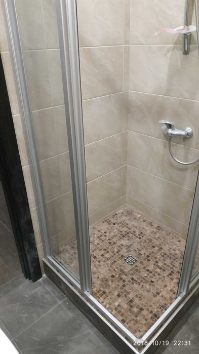 Сан узел совмещён. Душевая с трапом, система раздвижки ravak.
