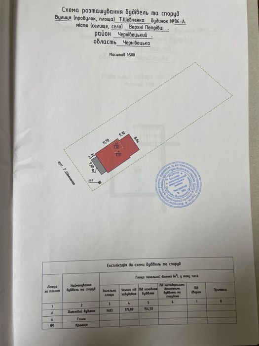 * Місце розташування земельної ділянки - село Верхні Петрівці, вул. Шевченка Тараса, Чернівецького району Чернівецької області.Сторожинецького району