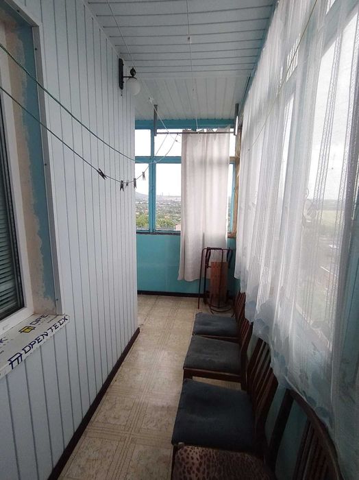 - Великий кутовий балкон, засклений і обшитий пластиком — у кімнаті тепло навіть взимку