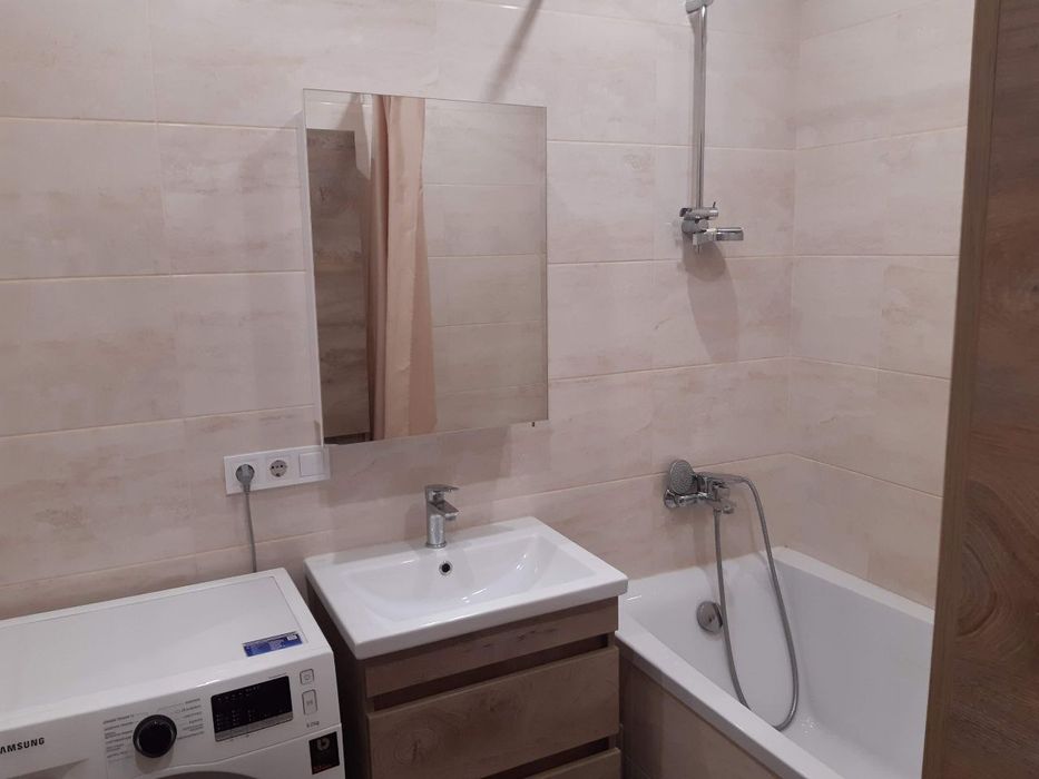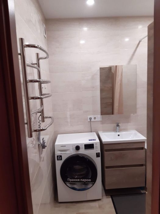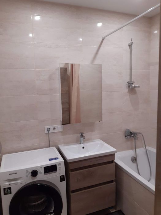Ванна: акрилова велика ванна, умивальник з тумбою підвісною, шафа підвісна, витяжка, палатенцесушарка електрична, дзеркало, шторка для ванни, пральна машина.