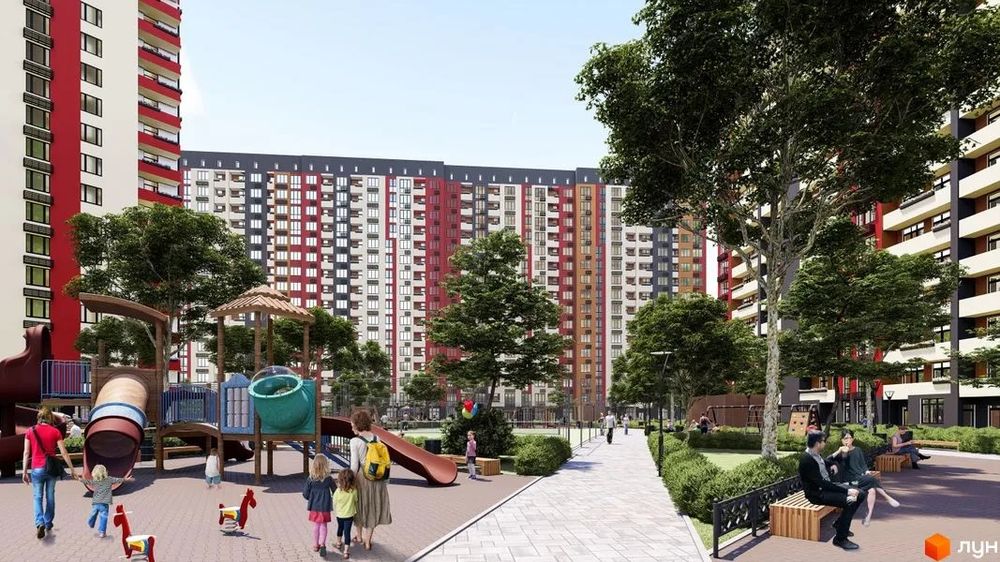 *Перші поверхи – нежитлові, у секції два ліфти. Двір без машин, облаштований дитячими та спортивними майданчиками, а також зонами відпочинку. Є підземний паркінг