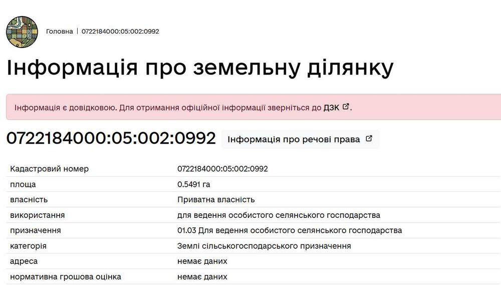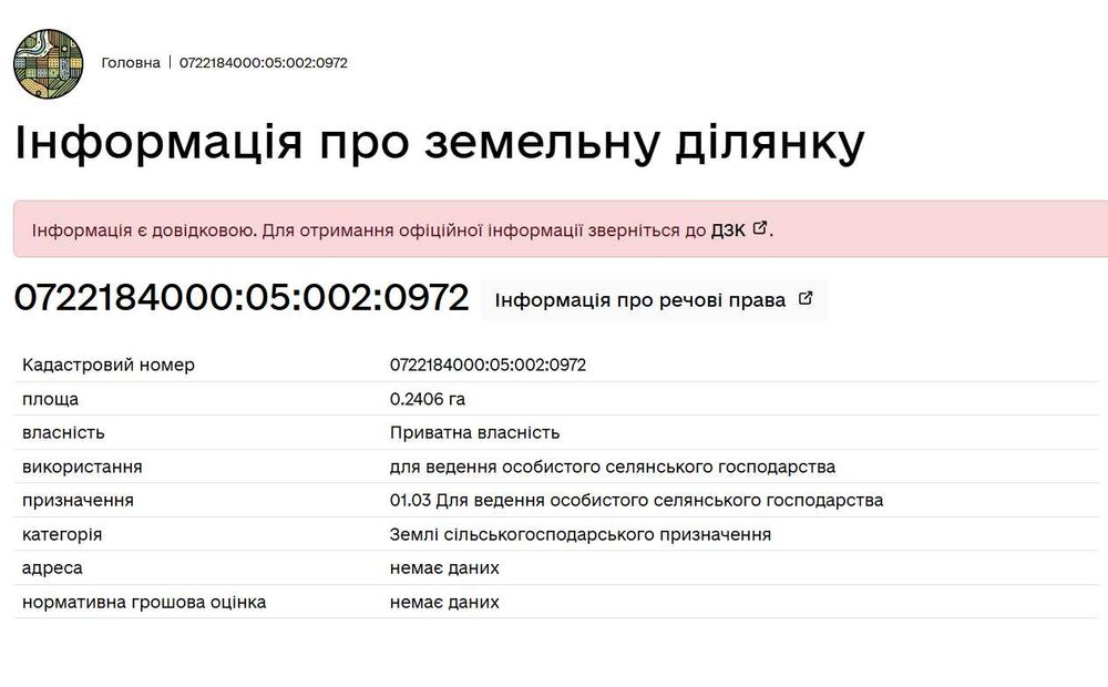 | Земельна ділянка: |
