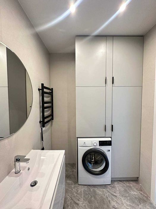 У ванній душова кабіна, електрична рушникосушка, пральна машина, бойлер, велика шафа.