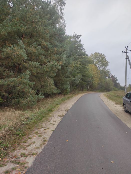 Свіжа асфальтна дорога від траси до ділянки, Електроопори до межі ділянки.
