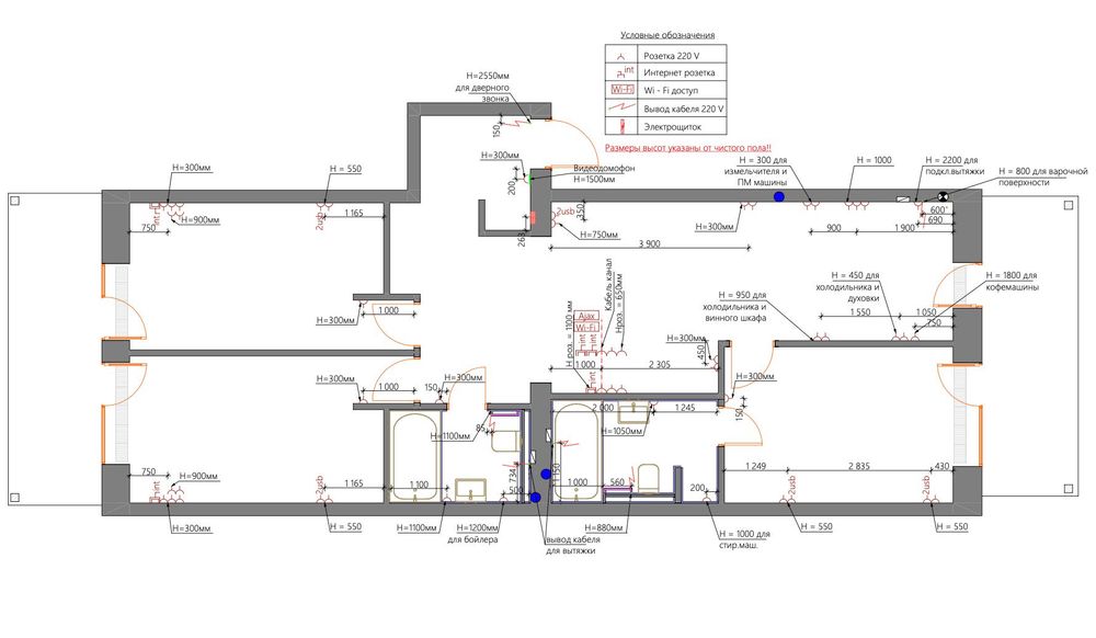 По квартирі виконана вся електрика, а також розведення в щиток слабострумів для керування системою розумного будинку Alexa від Google з можливістю керувати розетками, світлом, кондиціюванням, вентиляцією, опаленням, підігрівом підлог, водою, датчиками протікання, електричними приводами для штор. На двох балконах, у передпокої, ванних кімнатах встановлені електричні теплі підлоги з терморегуляторами. Встановлено два електричні полотенесушителі. Проведено прокладання силового кабелю від щитка до балкона під автономну систему сонячних панелей (панелі можна встановити на даху балкона) та стійки з резервними АКБ.