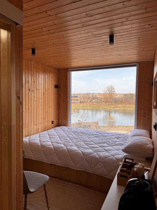 В будиночку є велике двохмісне ліжко з видом на озеро.