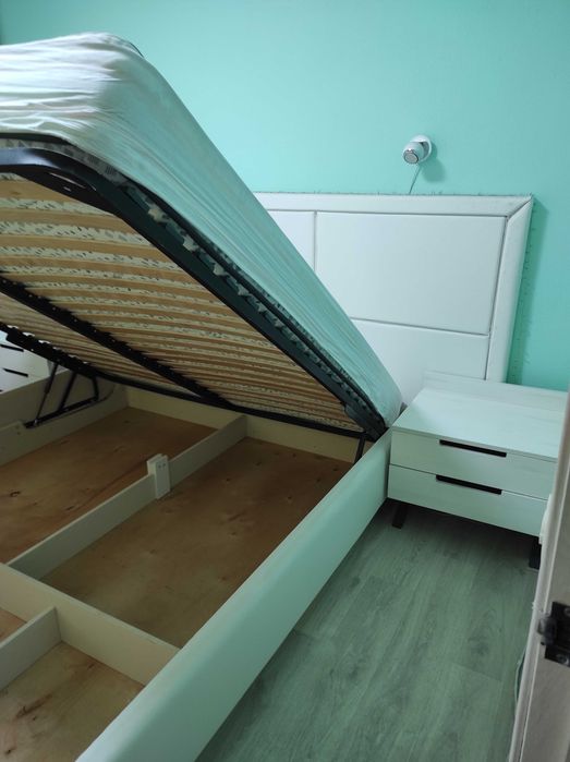 Меблі у двох кімнатах та в коридорі виготовлялися за індивідуальним замовленням. У спальні встановлене велике дороге ліжко з підйомним механізмом та м'якою спинкою. Ортопедичний дорогий матрац. Тумбочки виконані в ніжно білому стилі під колір самого ліжка.