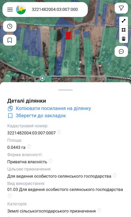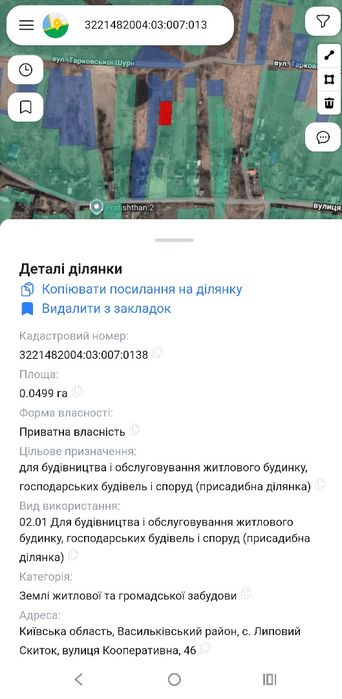 Дві суміжні ділянки яких загальна площа 9,44 сотки два кадастрових номери,одна ділянка 5 соток під забудову .кадастровий номер 3221482004:03:007:0138 інша 4,44 сотки під сільськогосподарське угіддя 3221482004:03:007:0007