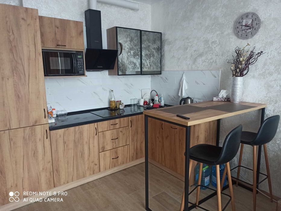 - сучасні меблі (двоспальне ліжко з ортопедичним матрацом та місткою нішею для речей, розкладний диван у залі, вбудована шафа, комод, універсальний стіл, гостинний гарнітур, стильна кухня з високим барним столом та стільцями)