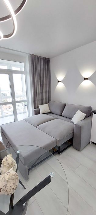 Сучасна кухня з вбудованим холодильником, мікрохвильова піч. Робоче місце, розкладне ліжко-диван з трьома положеннями для здорового сну.