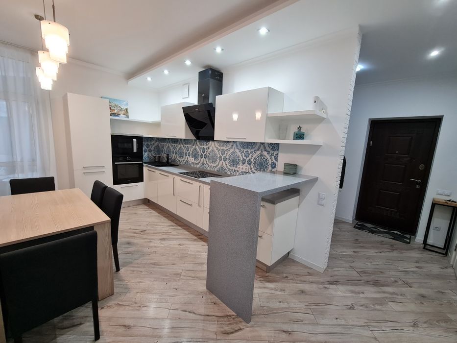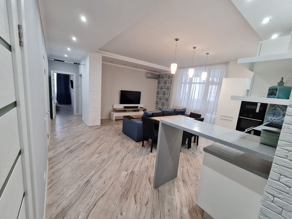 Велика кухня-студія, дитяча кімната, кабінет і спальня. Квартира повністю укомплектована меблями та побутовою технікою, вбудована кухня, гардеробна кімната, два сан-вузла, пральня посудомийна машини. Три кондиціонери, велика лоджія з диваном.