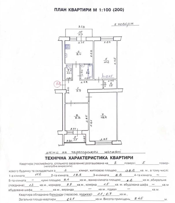 Загальна площа квартири: 64.1 м²