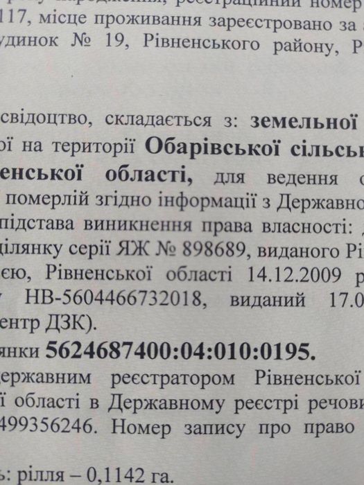 Продам земельну ділянку Обарів; Продам земельну ділянку 0,1142 га у чудовому місці, район Ювілейний ( село Обарів), поряд вже є будинки, всі деталі по телефону 09******79 Світлана