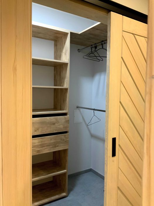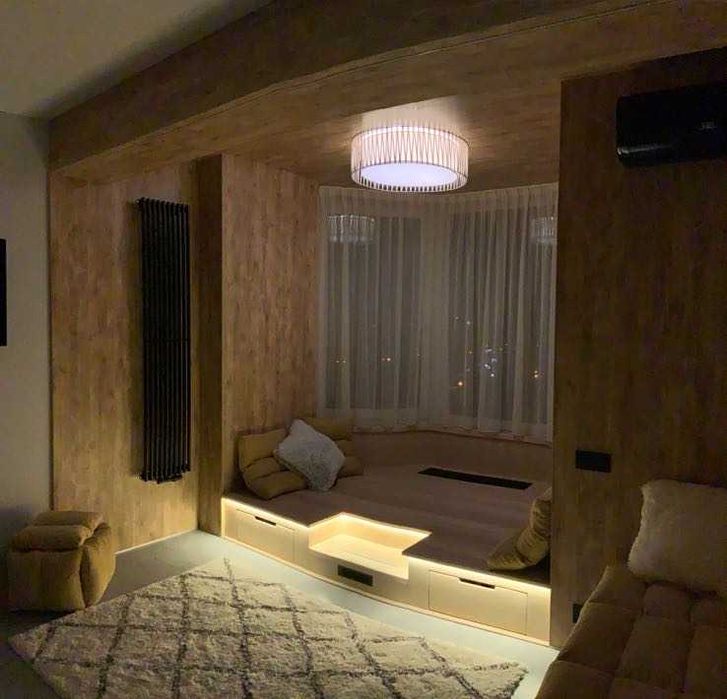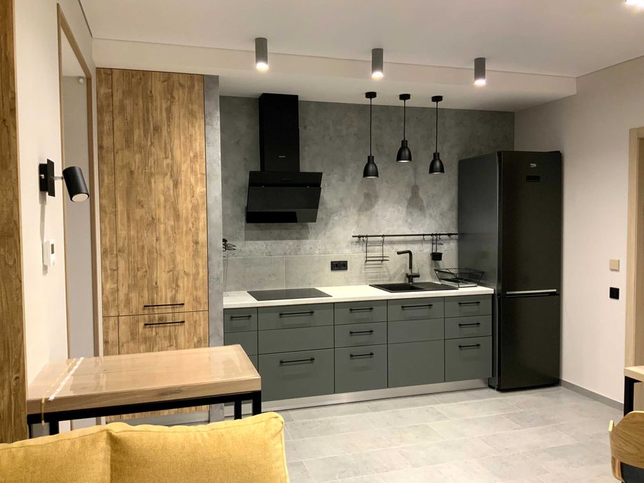 Вдале дизайнерське зонування кухні-їдальні, спальної зони, зони відпочинку, робочого місця. С\в – суміжний, лоджія, передпокій з окремою місткою гардеробною. Загальна площа 46м.кв.