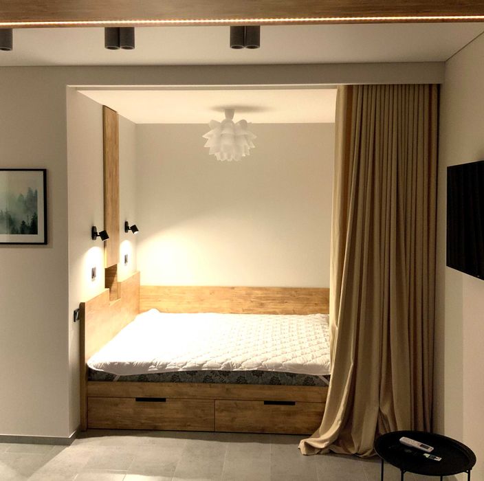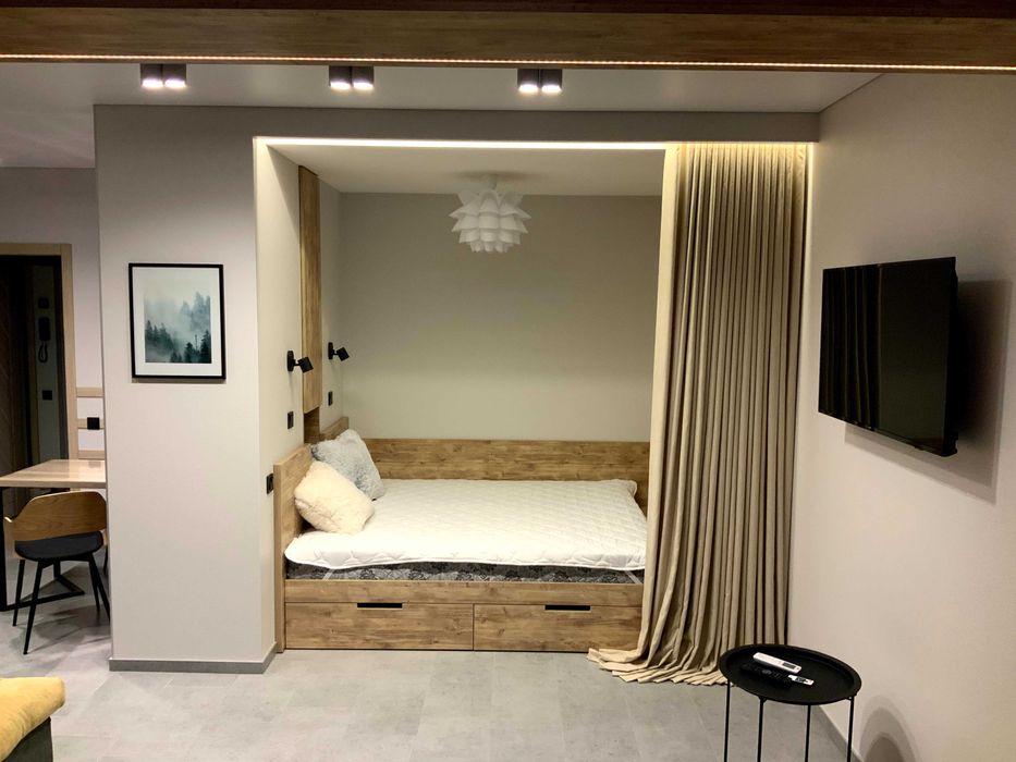 Затишна студія на Леваді від ГОСПОДАРЯ; Комфортабельна студія в новобудові на Леваді. Чудовий панорамний вид з великого еркерного вікна над подіумом з натурального дерева (8й поверх).