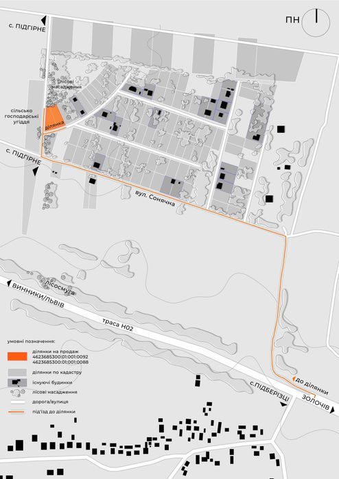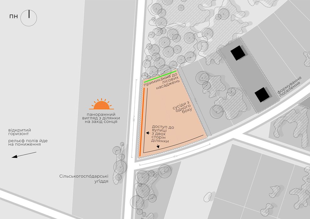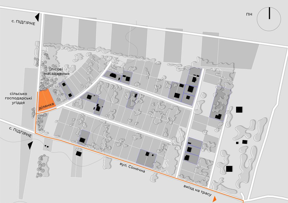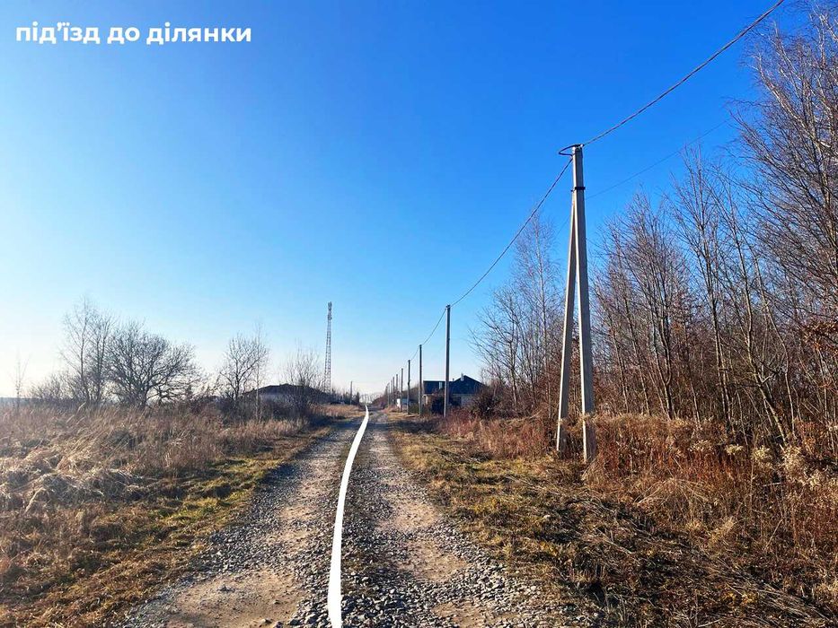 - Поселення на підвищенні – ділянка розташована вище рівня траси та села, що забезпечує кращий мікроклімат, шумозахист та відчуття простору.