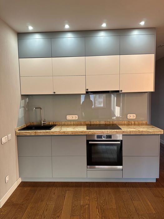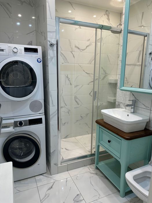 Вся квартира зроблена з дорогих матеріалів. Частина меблів виконана в натуральному дереві, частина в МДФ, є 2 дуже зручних італійських шкіряних крісла, та робочій стіл. Є 2 зручних ліжка. Є вся кухонна техніка, кухонна стільниця виконана в оніксі. Також є пральна машина і сушильна машина. Кондиціонер, якій працює і на обігрів, і на охолодження. Є підігрів підлоги.