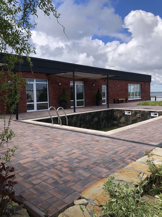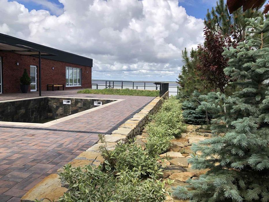 3 комнаты, большая кухня студия с понорамными окнами 60кв. С каждой комнаты выход на бассейн. Озеленение по всему участку.