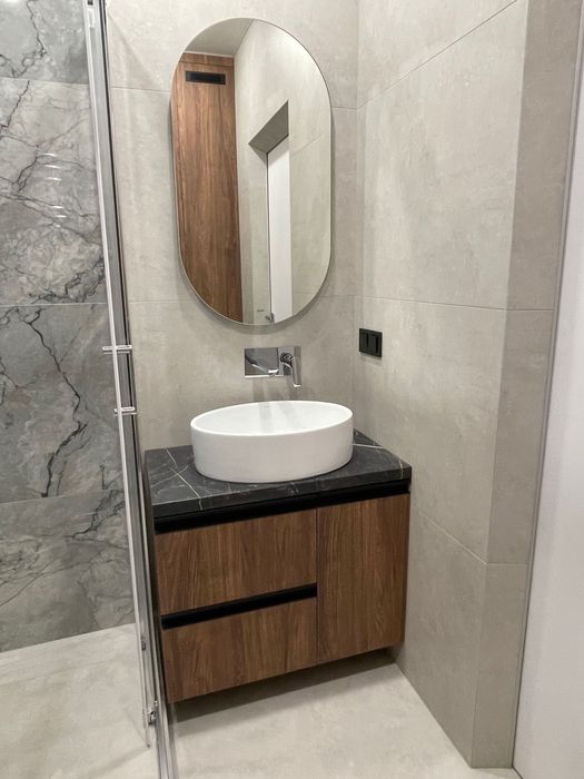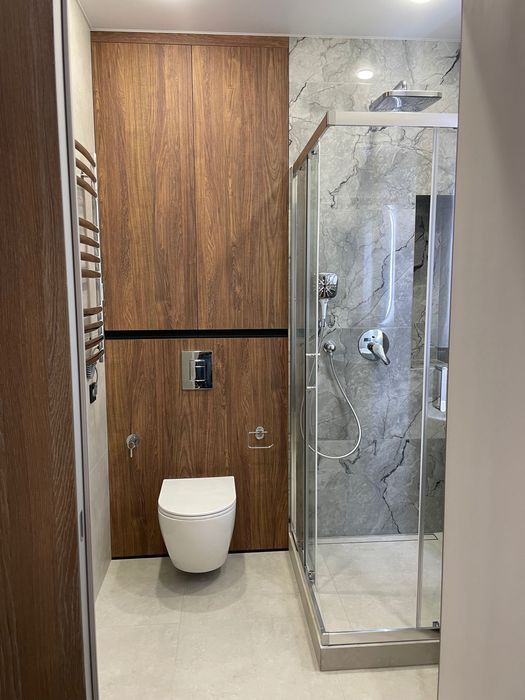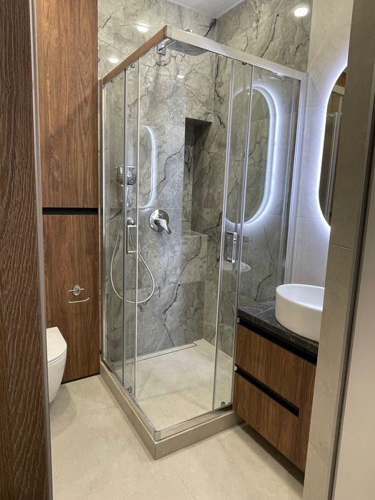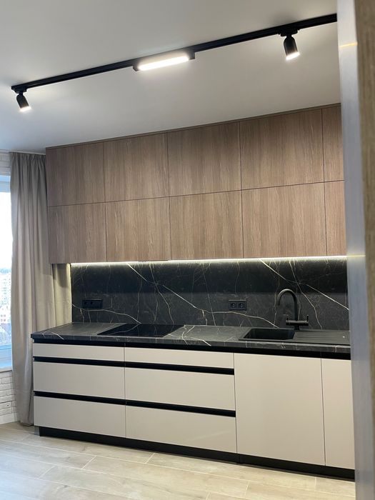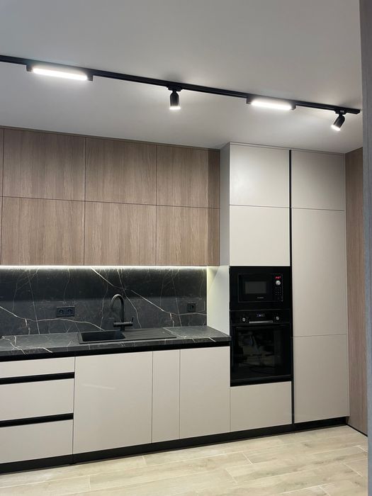 Якісна техніка, меблі та сантехніка. Кухня укомплектована індукційною варочною поверхнею Bosch, електричною духовою шафою Bosch, мікрохвильовою піччю Bosch, вбудованим холодильником Samsung, витяжкою – вся техніка на гарантії, купувалась у грудні.