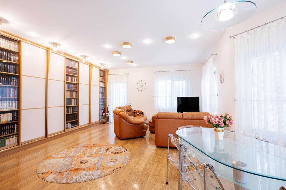 житлова площа – 138 м.кв (6 житлових кімнат – вітальня, 4 спальні, офіс);