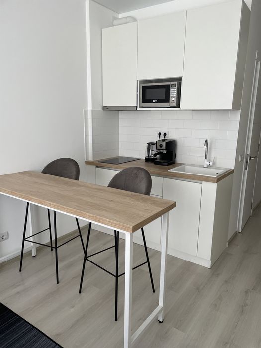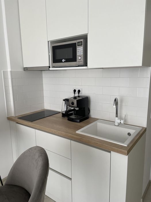 техника: Холодильник встроенный No Frost, индукционная варочная поверхность на 2 комфорки, новая микроволновка. Чайник, кофемашина, стиральная машина, кондиционер, телевизор.