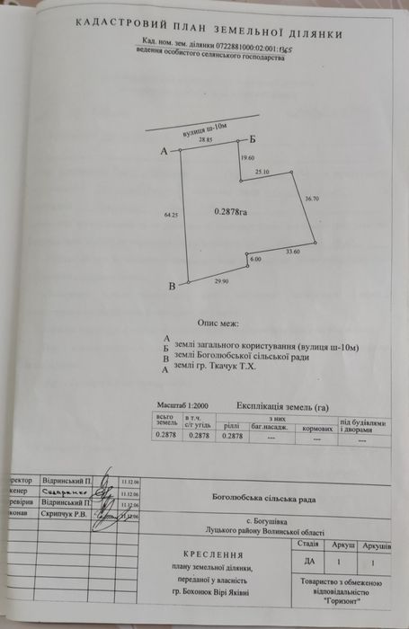 Земельна ділянка 29 соток село Богушівка; Продам земельну ділянку в с.Богушівка ,Луцька отг .шість кілометрів від Луцька площа ділянки 29 соток розташована на житловій вулиці газ ,і світло проходять біля ділянки доїзд асфальтований ,до зупинки міської маршрутки 300 метрів ділянка розташована на підвищенні з гарними краєвидами ціна вказана за сотку. Межі ділянки винесені на місцевості землевпорядником, ділянка знаходиться с.Богушівка вул Зелена ціна вказана за одну сотку