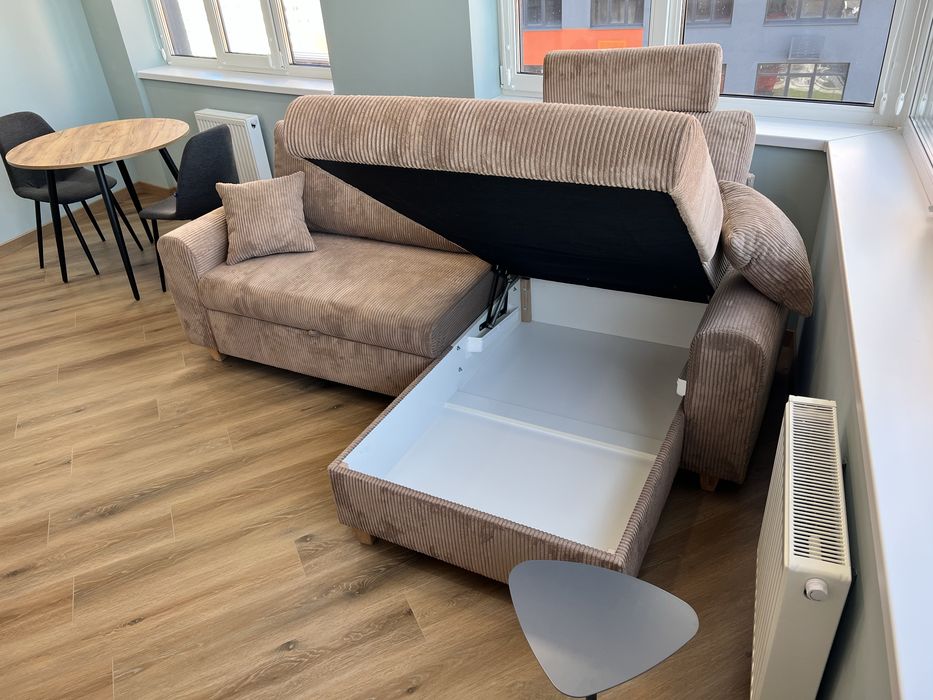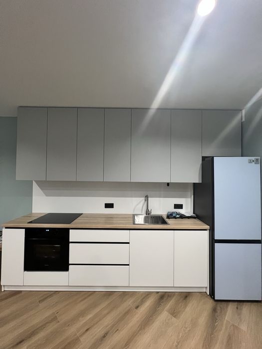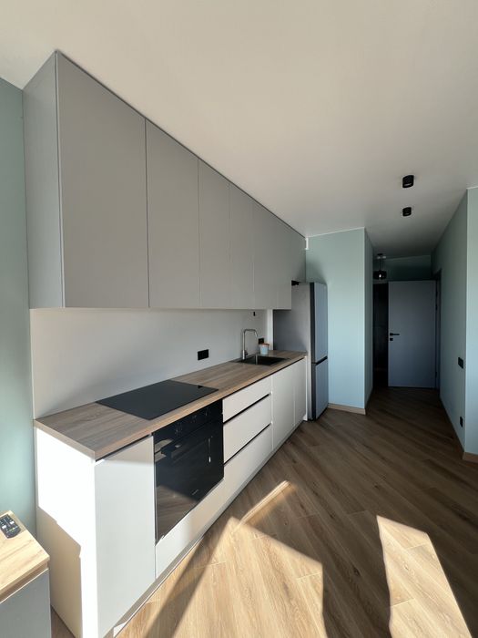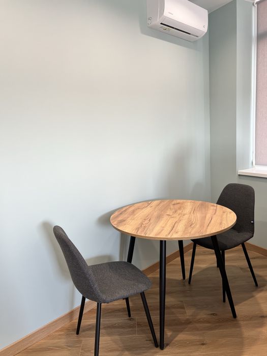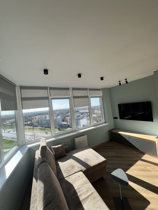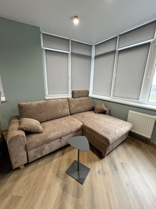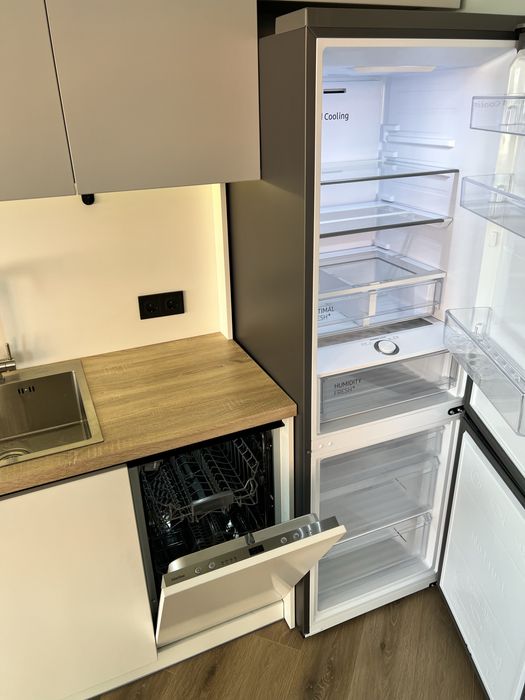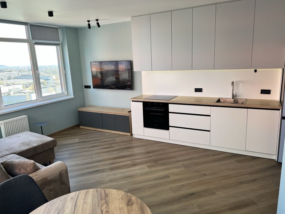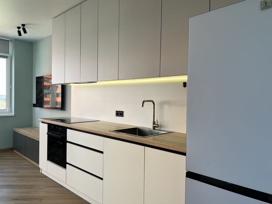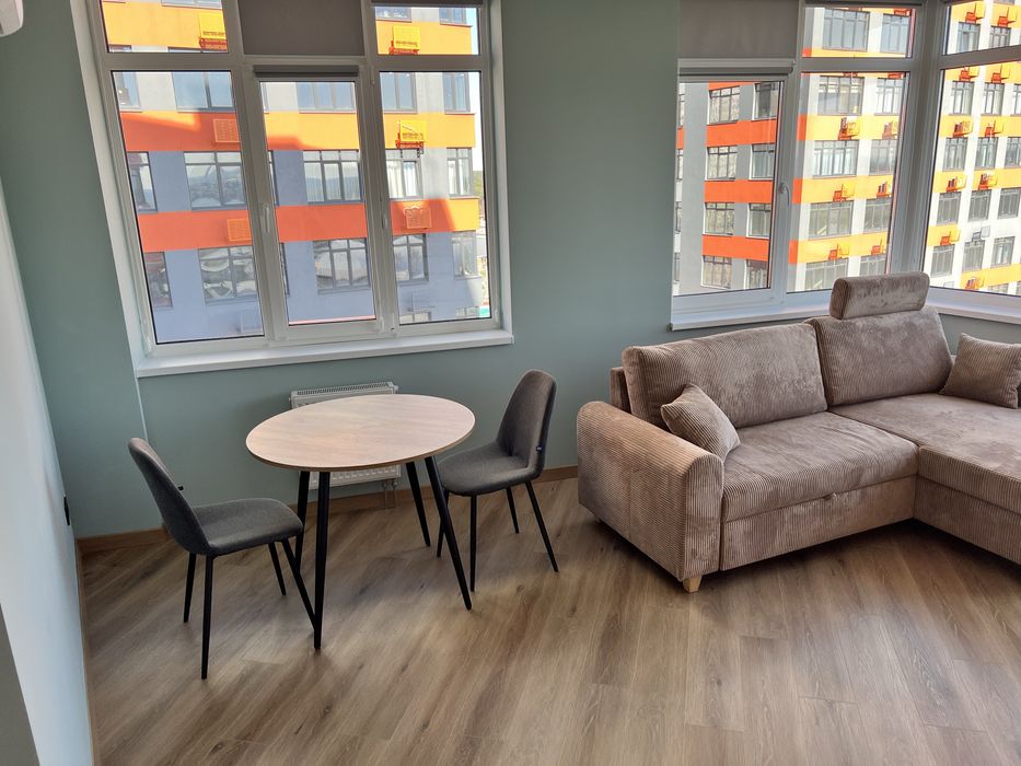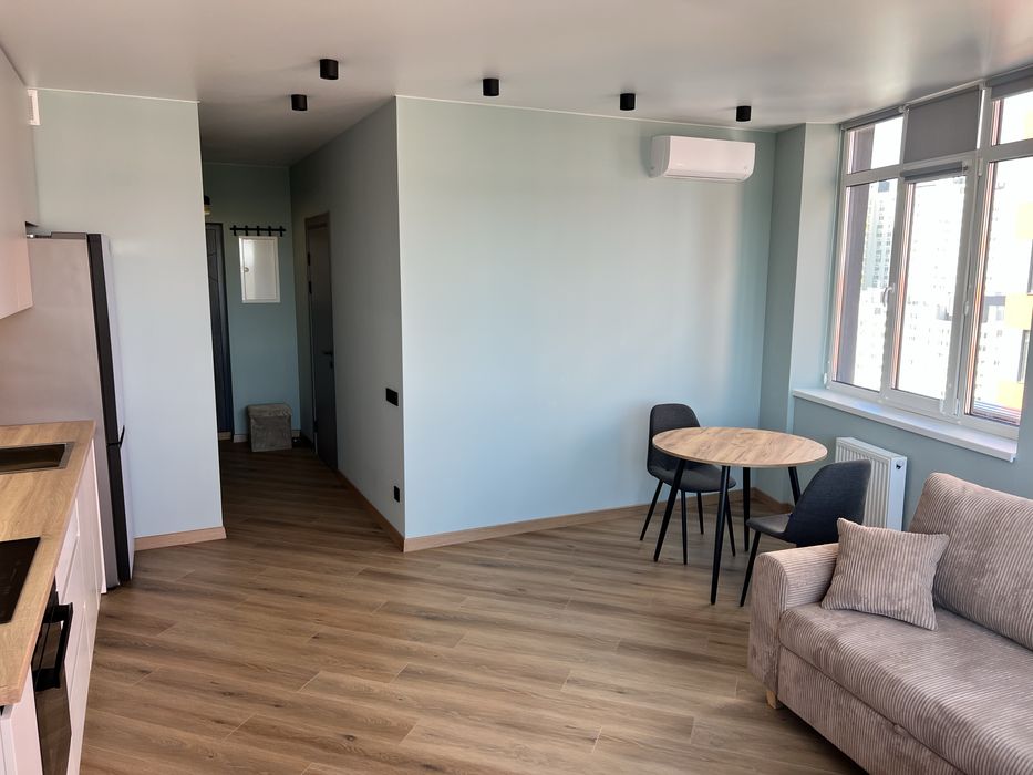 Кухня-вітальня з панорамними вікнами з ролетами, гарний вид з вікна. Обідній стіл, диван розкладний з кавовим столиком, телевізор 55 дюймів, проведено вай фай, домофон підключається до телефону, кондиціонери, холодильник, духовка, плита, витяжка, посудомийна машина, датчики від затоплення, багато місця для зберігання, підсвітка сенсорна.